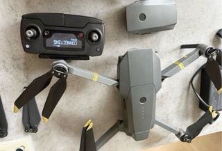 Dron DJI Mavic Pro en color gris y detalles dorados. Incluye control remoto y baterías. - Dron plegable. - Control remoto con pantalla. - Baterías adicionales, cargador, y estuches para mando y dron. Pocos vuelos y sin ningún accidente.