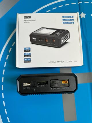 Cargador de baterías multifunción versátil y de gran calidad. Apenas usado, prácticamente nuevo. Especialmente recomendado para baterías de drones, radiocontrol, etc - Admite conectores xt30 y xt60 - Con balanceador de carga, para una carga de celdas uniforme - Fuente alimentación integrada - AC100W / DC300W - Tamaño muy compacto (11,2cm x 7,3cm x 3,8cm) ocupa muy poco espacio - Soporta baterias: LiPo, LiHV, LiFe, Lilon, LTO 1-6S, NiMH @1-16S Pb @1-10S - Incluye multímetro y funciones especiales como descarga, carga segura para almacenamiento de baterías, etc - Pantalla color de gran resolución - Alertas de voz programables
