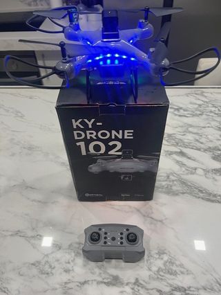 Dron modelo KY-102 con luces LED azules y control remoto incluido. Listo para volar. - Dron con diseño moderno. - Control remoto ergonómico.