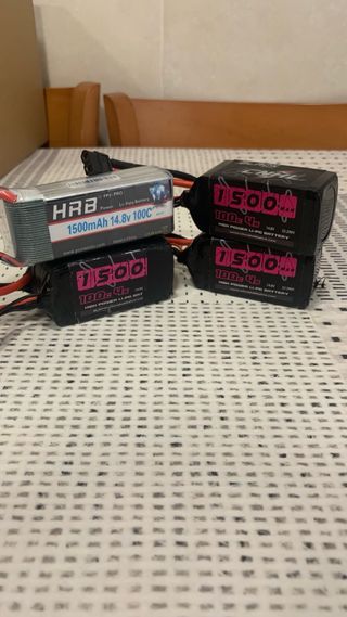 Conjunto de cuatro baterías LiPo de alta potencia. Tres de ellas se encuentran en bastante buen estado y la otra algo más dañada. (HRB tres veces usada) - Capacidad: 1500mAh - Voltaje: 14.8V - Tasa de descarga: 100C - Marca: HRB y CNHL - Color: Negro y plateado