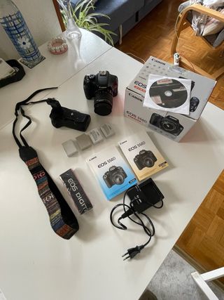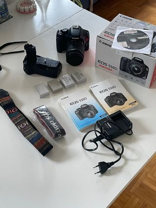 Se vende cámara digital Canon EOS 550D con varios accesorios. - Cuerpo de cámara Canon EOS 550D. - Objetivo 18-55mm - Grip para dos baterías. - Cuatro baterías, dos originales. - Cargador original. - Correa original + correa extra. - Manuales de usuario. - CD de software. Funciona perfectamente.