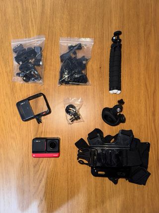 Cámara de acción Insta360 ONE RS en color negro y rojo. Ideal para capturar tus aventuras. - Diseño compacto y ligero. - Lente gran angular. - 8 k - Se vende con arnes de pecho y multiples accesorios Muy poco uso