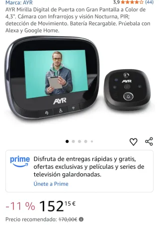 Mirilla digital AYR con pantalla a color de 4,3 pulgadas. Ideal para tu puerta. - Cámara con infrarrojos y visión nocturna. - Detección de movimiento. - Batería recargable. - Compatible con Alexa y Google Home.