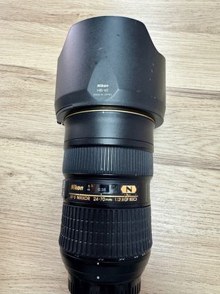 Objetivo profesional Nikon AF-S NIKKOR 24-70mm f/2.8G ED. Marcas de uso y gomas cedidas, al hacer zoom esta ya un poco duro por eso el precio - Montura Nikon F. - Apertura máxima f/2.8. - Elementos de cristal ED para una calidad de imagen superior. - Incluye parasol HB-40.