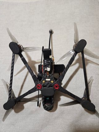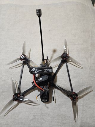 Drone FPV Rekon 5. Drone FPV con helices de 5 pulgadas, video analógico de 800 mW, cámara Caddx Ratel 2, tarjeta controladora F7, sistema radio control TBS Crossfire, y motores de 6S, aunque puede funcionar perfectamente a 4S. Tiene solo tres vuelos.