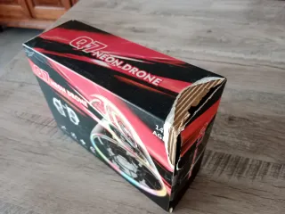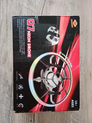 Dron Q7 Neon con luces LED vibrantes que iluminan todo el marco. Proporciona un efecto de iluminación potente y una experiencia de vuelo vívida. - Luces LED vibrantes. - Control remoto 2.4GHz. - Giroscopio de 6 ejes. - Modo sin cabeza. La caja se rompió al abrirla pero el dron está en perfecto estado.