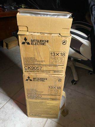 Set de papel y cinta para impresoras Mitsubishi Electric. COMPLETAMENTE NUEVOS 2 cajas nuevas + 1 caja con 2 rollos de papel que valen como 1. También se regala 1 rollo de tinta nuevo = total 3 rollos tinta y uno a medias. - Modelo CK9057. - Tamaño 13x18.