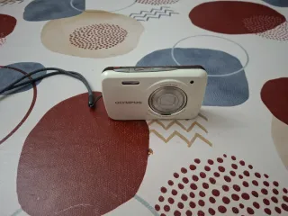 Cámara digital compacta Olympus en color blanco y gris. Incluye correa. - Diseño elegante y portátil. - Lente Olympus. - Correa de sujeción incluida.