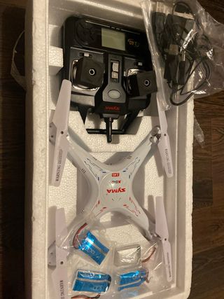 Se vende dron Syma X5C en color blanco y negro, listo para volar. - Mando a distancia incluido. - Hélices de repuesto. - Baterías adicionales.