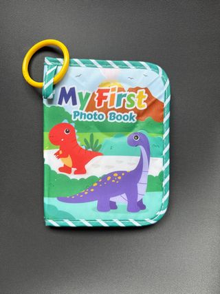 Álbum de fotos para bebés con diseño de dinosaurios. Incluye un aro para colgar. - Portada con dinosaurios y paisaje. - Colores vivos y llamativos. - Material textil.