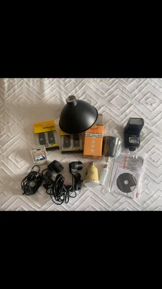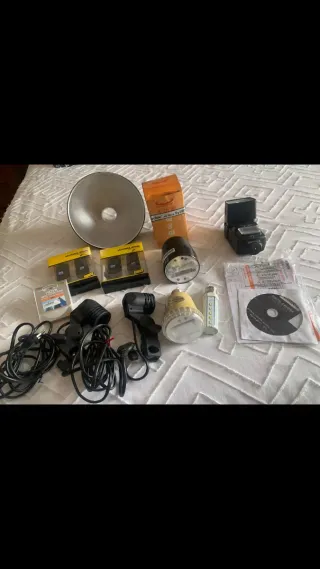 Conjunto de accesorios para fotografía. - Difusor negro. - Transmisores inalámbricos. - Flash. - Bombillas. - Cables y soportes. - CD con software.