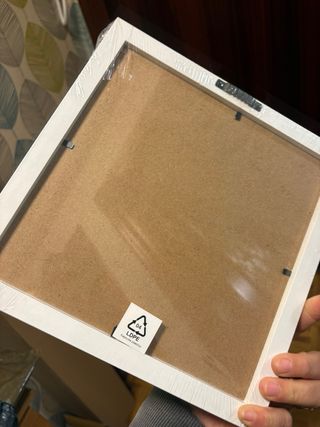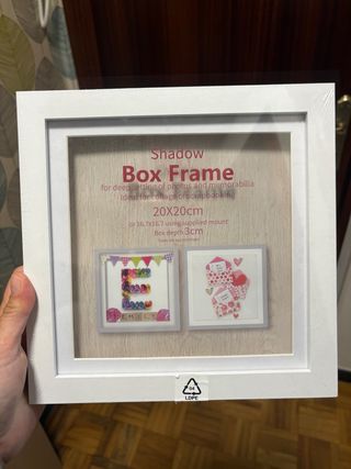 Marco de caja de sombras para fotos y recuerdos. Ideal para collages y scrapbooking. - Medidas: 20x20cm. - Profundidad: 3cm. - Incluye soporte.