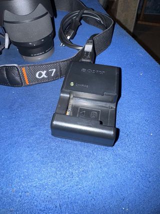 Cámara Sony Alpha 7 con lente y baterías adicionales. - Cuerpo de cámara Sony Alpha 7. - Lente. - Dos baterías. - Correa para el cuello.