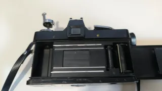Cámara analógica Cosina C1 en color negro. Cámara reflex básica. Sin modos automáticos. Perfecta para empezar en el mundo de la forografia analógica y manual. El plástico está algo afeado. Se podria limpiar con alcohol isopropilico. Incluye objetivo. Montura pentax, por ello hay muchas opciones para ampliar equipo. Funcionamiento correcto.