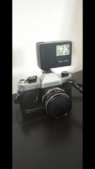 Cámara fotográfica Rollei SL350 con flash Nera-Mini. - Cuerpo en color plata y negro. - Incluye flash Nera-Mini. Se regala su funda ergonómica de auténtica piel