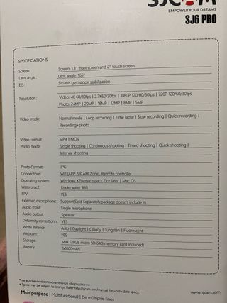 Cámara de acción SJCAM SJ6 PRO con pantalla táctil. - Grabación de vídeo 4K a 60 FPS. - Pantalla táctil de 2 pulgadas. - Estabilización electrónica de imagen (EIS). - Captura de fotos de 24 MP. - Lente gran angular de 165 grados. - Formatos de vídeo H.264 y H.265. - Conectividad Wi-Fi. - Puerto USB Type-C.