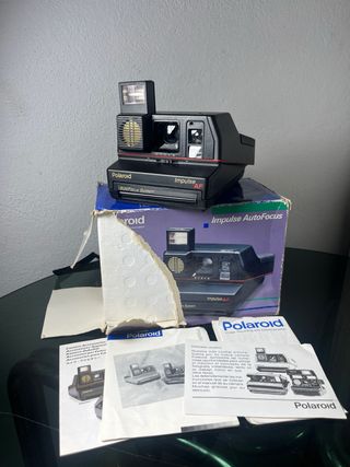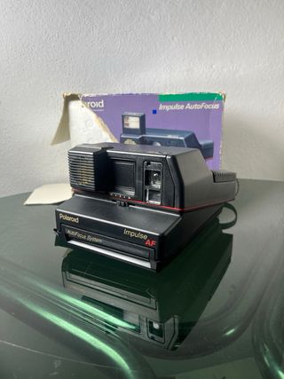 Cámara Polaroid Impulse AF con sistema Autofocus. La cámara viene con su caja (algo rota), sus corchos y sus manuales originales. Durante muchos años ha estado guardada, cogiendo polvo, sin usarse rescatada para volver a darle esa vida. Usa carrete Polaroid 600.