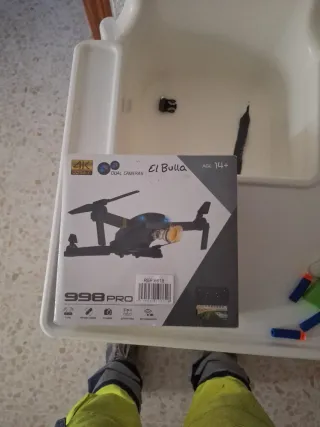 Es un dron en su caja con una cámara 34K y elizes plegables