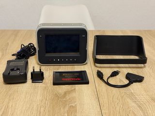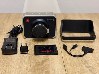 Blackmagic Cinema Camera 2.5k + accesorios: - Cargador de corriente. - Adaptador de enchufe. - Unidad SSD SanDisk de 240GB. - Parasol. - Adaptador para SSD a PC. - Montura EF. La batería de la cámara dura poco.