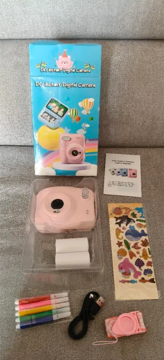 Kit de cámara digital instantánea para niños, con tarjeta 32Gb NUEVA A ESTRENAR Sacada de la caja para las fotos. - Cámara digital instantánea rosa. - Rollos de papel para impresión. - Rotuladores de colores. - Cable de carga USB. - Pegatinas temáticas de animales marinos.