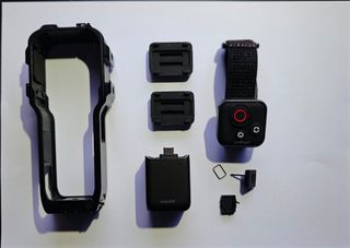 Conjunto de accesorios para la cámara Insta360 ONE RS - Carcasa protectora. - Módulo de carga USB-C. - Control remoto con correa - Dos protectores conexion - Pequeños adaptadores y clips.