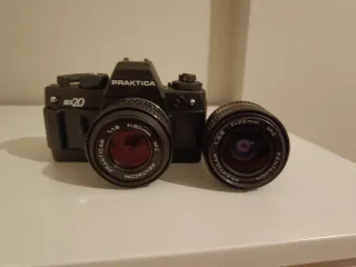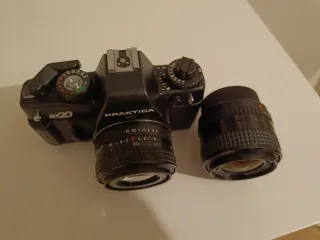 Cámara réflex analógica Praktica BX20 en color negro. Incluye dos objetivos. - Objetivo Prakticar 1:1.8 f=50mm - Objetivo Pentacon 1:2.8 f=28mm Fotómetro funciona perfectamente, con pila nueva incluida.