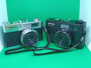 Se venden dos cámaras analógicas Werlisa. - Una cámara es plateada con detalles en negro y la otra es completamente negra. - Ambas cámaras incluyen sus correas de transporte, también incluye sus fundas