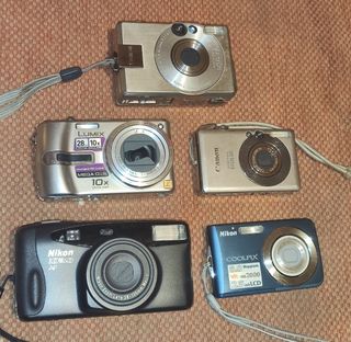 vendo esta colección de cámaras de fotos digitales y una analógica que era de mi madre, desconozco si funcionan y por ello voy a poner como que no lo hacen a pesar de que estoy casi seguro de que alguna funciona, * los modelos de cámaras son los siguientes : - nikon zoom 500 AF - Panasonic lumix tz2 - canon digital ixus 50 - canon digital ixus 330 - nikon coolpix s210 están todas estéticamente en perfecto estado cuentan con sus respectivas baterías las que tienen, no tienen tarjetas sd ni micro sd ni cables de carga y no puedo garantizar que funcionen, a pesar de que alguna puede que funcione para coleccionismo de cámaras an