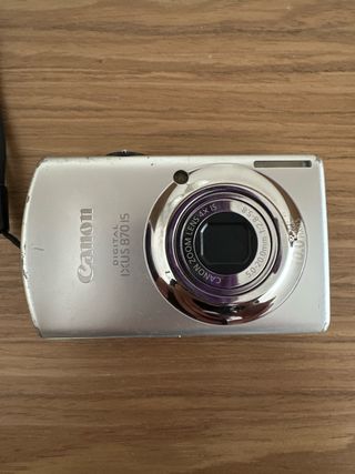 Cámara digital Canon IXUS 870 IS en color plata. Incluye cargador, batería canon, dos tarjetas SD, y funda. Sensor CCD de 10,0 megapíxeles efectivos. Formato de fotos: JPEG con múltiples resoluciones (hasta 3648×2736). Objetivo zoom óptico 4x. Apertura: f/2.8 (gran angular) – f/5.8 (tele). Estabilización óptica de imagen (IS) para reducir el desenfoque por movimiento.  Enfoque automático con detección de rostros y sistema AiAF. Distancia mínima de enfoque macro: alrededor de 2 cm. Rango ISO: Auto, 80, 100, 200, 400, 800, 1600.