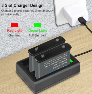 Kit de carga para tu cámara Insta360 X3. Incluye un cargador triple y dos baterías. - Cargador con capacidad para 3 baterías. - Dos baterías de 1800mAh 6.9Wh. - Incluye cable USB a USB-C.