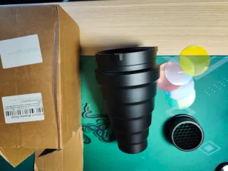 Snoot para flash fotográfico con accesorios. SIN ESTRENAR - Incluye geles de colores para modificar la luz. - Incluye accesorio tipo panal de abeja.