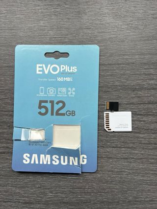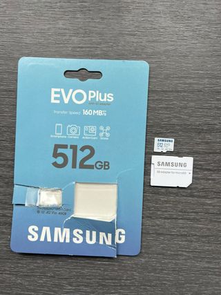 Tarjeta de memoria microSD Samsung EVO Plus de 512GB con adaptador SD. - Capacidad: 512GB - Velocidad de transferencia: 160 MB/s - Ideal para smartphones, cámaras, drones y cámaras de acción. - Incluye adaptador SD. Funciona perfectamente, muy poco uso. La vendo porqué no la necesito.