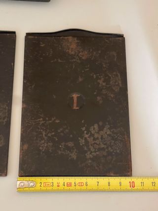 Pack de tres portaplacas antiguos, para cámaras de medio formato. Medidas 10x15 aproximadamente (ver fotos). Con funda de cuero negra para transporte. Uno de los chasis tiene rieles en los laterales, los otros dos tienen el lateral plano. No hay marca visible. cámara, analógicas, film, antigua, antigüedad, coleccion, coleccionismo, coleccionista, pack, lote, vintage, fotografia, fotos, fotografo, clásica, analógica, compacta, caja, cajon, plástico, baquelita, piezas, repuestos, reparacion, hogar, decoracion, estudio, fotografíca, chasis, metal, metálicos, placa, placas, formato, fuelle