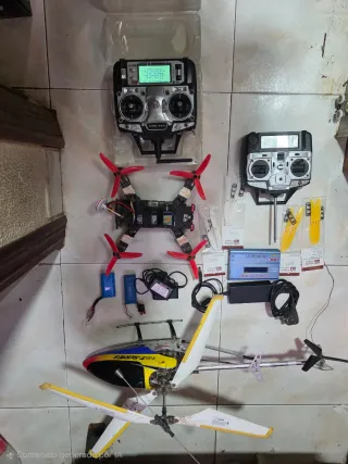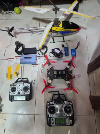 Lote de aeromodelismo que incluye un dron y un helicóptero a radiocontrol, junto con sus mandos y accesorios. - Dron con hélices rojas. De competicion - Helicóptero con palas blancas y amarillas. - Dos mandos de control remoto. - Baterías y cargador. - Hélices de repuesto.el dron y su mando anda perfectamente el elicoctero no pero lo entrego con el lote porsi lo quiere para reparar o de coleccion el dron es de competicion