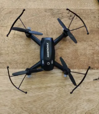 Drone de color negro con cuatro hélices. El cuerpo principal es ovalado y aerodinámico. - Hélices de plástico negro. - Luces LED rojas y verdes en las hélices.