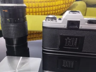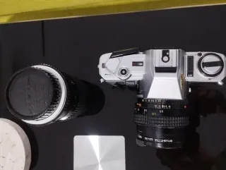 Cámara analógica minolta en tonos plata y negro. Incluye objetivo. - Objetivo con tapa. - Dial de velocidad de obturación. - Zapata para flash.