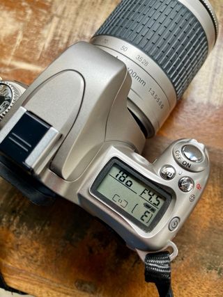 Cámara analógica Nikon F55 en color plata y negro. Un clásico para los amantes de la fotografía. Incluye objetivo 28-100mm. F/3.5-5.6. Ideal para los amantes de la fotografía analógica. - Cuerpo plateado con detalles en negro. - Correa original de sujeción incluida. - Bolsa para transportarla. - Pilas recién puestas.