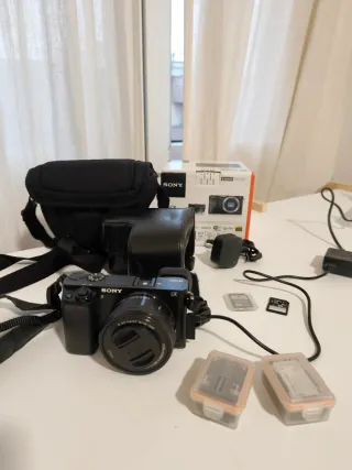 Cámara digital Sony Alpha 6000 ILCE con accesorios y objetivo intercambiable. Objetivo E PZ 16-50mm F3.5-5.6 OSS en perfecto estado. 24.3 mega píxeles 11frames por segundo Oled Tru-finder. - Incluye funda de transporte. - Incluye funda de cuero. - Incluye cargador europeo y otro. - Incluye dos tarjetas de memoria, 4 y 16gb. - Incluye 3 baterías, la puesta y dos extras.