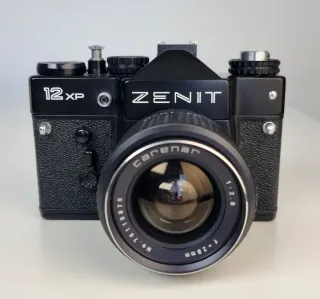 Cámara réflex analógica de carrete de 35 mm ZENIT XP. Fabricada en la antigua URSS en los años 80. Muy buen estado y muy robusta. Dicen que es el "Kalashnikov" de las cámaras". *Puedes ver muy buenos comentarios en "diariodeunpixel". Objetivo Carenar 28mm F2.8 con montura M42. Cristales limpios, impecable. Totalmente funcional, incluído fotómetro. Visor y autodisparador OK. Probada con carrete de prueba. Incluye tapa del objetivo y FUNDA rígida Zenith. Perfecta como REGALO para empezar en fotografía analógica. Las fotografías forman parte de la descripción. Hago envíos por Wallapop Correos.