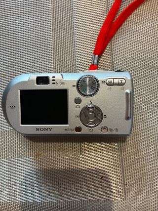 Cámara digital compacta Sony DSC-P100 en color plateado. Ideal para capturar tus momentos. - Zoom óptico. - Pantalla LCD. - Correa de sujeción roja incluida.