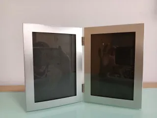 Marco de fotos doble con acabado plateado. Ideal para colocar dos fotografías de (10 x 15) - Material: Metal. - Color: Plateado. - Diseño: Doble marco.