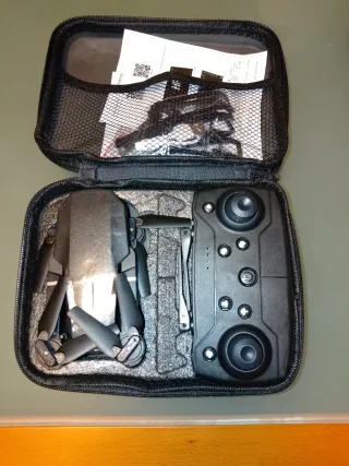 Dron plegable de color negro, listo para volar. Incluye su mando a distancia para un control total. Con tres baterias recargables. Aún no lo he volado ninguna vez. - Diseño compacto y portátil. - Luces LED frontales azules. - Mando con joysticks y botones de control.
