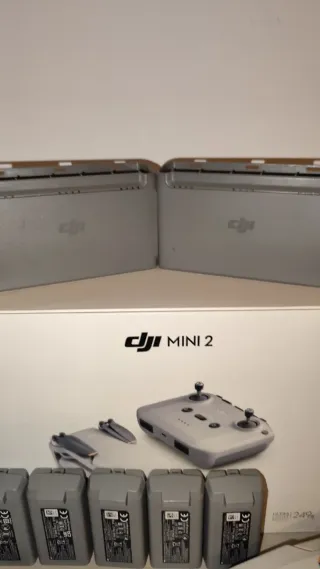 Drone Dji Mini 2 en color gris, ideal para capturar imágenes aéreas. La cámara tiene un problema en el estabilizador y está bloqueado. He preguntado y tiene fácil reparación pero ya me he comprado el Mini 3. El dron vuela y graba, pero no deja manejar el eje de la cámara. - No incluye mando a distancia. - 2 baterías. - Hélices de repuesto. - Cables de conexión.