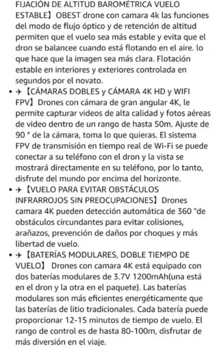 Drone OBEST con cámara 4K HD y funciones de vuelo estable. - Fijación de altitud barométrica para un vuelo más estable. - Cámara gran angular 4K para videos y fotos de alta calidad. - Sistema FPV de transmisión en tiempo real vía Wi-Fi. - Detección automática de obstáculos 360° para evitar colisiones. - Incluye dos baterías modulares de 3.7V 1200mAh para mayor tiempo de vuelo.