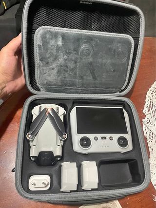 Drone Dji Mini 3 en color gris, ideal para capturar imágenes aéreas. - Incluye funda de transporte. - Baterías adicionales. - Hélices de repuesto. - Cable de carga. Solo falta el mando que me lo quedo para el otro dron. O cambio por dji air 2s Comprado el 14/05/2025