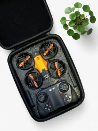 -Dron compacto con cámara, ideal para iniciarse en el vuelo. Para ver cámara se necesita una app especifica. - Diseño en naranja y negro. - Incluye control remoto. -El estuche para guardarlo. -Incluye 2 baterías recargables. -Incluye cable para cargarlo. -Incluye instrucciones. -Incluye piezas de repuesto y herramientas. -Mando extraíble y ajustable para apoyar el móvil y poder ver la cámara en directo. -El mando necesita pilas. -Cada batería tiene 20 min de autonomía aprox.
