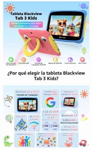 Tableta Blackview Tab 3 Kids de 7 pulgadas. Ideal para los más pequeños. - Pantalla táctil. - Asa portátil. - Control parental. - Modo eBook. - Conexión Wi-Fi 2.4G. REF2025309