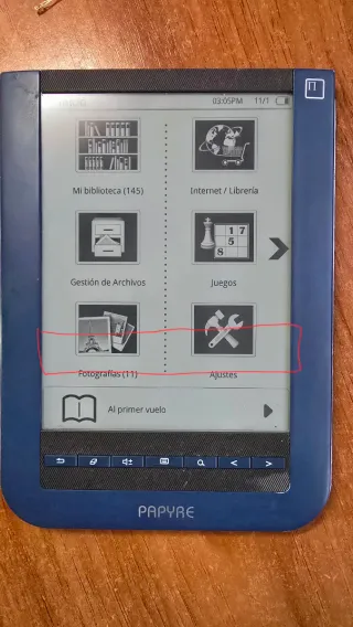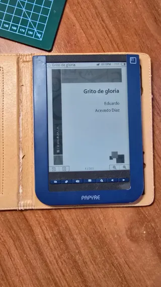 Ebook Papyre 622, con WiFi, pantalla táctil y tarjeta sd. ⚠️ATENCION: la pantalla presenta un fallo en el táctil en una banda estrecha (ver foto), no afecta a lectura ya que se puede usar gran parte de la pantalla táctil y los botones de pasar página. Se entrega con funda.