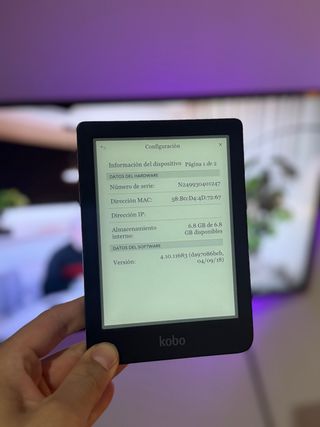 Dispositivo de lectura Kobo en color negro. - Número de serie: N249930401247 - Dirección MAC: 58:B0:D4:4D:72:67 - Almacenamiento interno: 6.8 GB de 6.8 GB disponibles - Versión del software: 4.10.11683 (da97086beb, 04/09/18)