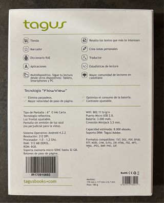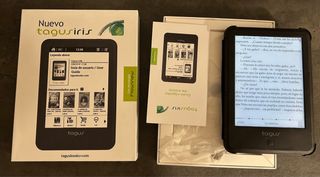 E-reader Tagus Iris en color negro. Incluye guía de usuario y caja original y cable. - Pantalla FlowView. - Conexión Wi-Fi. - Tiene luz. - Capacidad de almacenamiento interna. Regalo funda imantada aunque está como se ve en la fotografía. La batería está fenomenal. Los botones y pantalla funcionan a la perfección. Lo vendo porque me regalaron uno los Reyes. Está muy poco usado y muy cuidado.